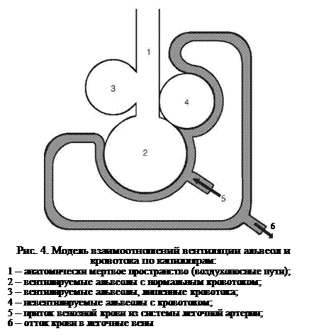 Соотношение между вентиляцией (V) и кровотоком (Q) выражается коэффициентом V/Q, который в норме составляет 0,8-1,0. Если участок легкого вентилируется, но лишен кровотока или, наоборот, кровоснабжается, но альвеолы не вентилируются, – такой участок не участвует в газообмене (рис. 3). Он как бы увеличивает физиологическое мертвое пространство.