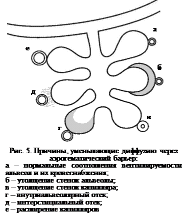 В условиях патологии может продолжаться перфузия невентилируемого пространства (рис. 5, г). Например, при местном спазме бронхиол, содержании в них вязкой слизи, сдавлении опухолью вентиляция участка альвеол резко снижена, а кровоток может оставаться достаточным. Вентиляция альвеол снижается также при снижении эластичности их стенок и перерастяжении, т.е. при эмфиземе. Во всех этих случаях кровь протекает мимо таких участков, не насыщаясь кислородом, и возникает артериальная гипоксемия. К такому же результату приводит сбрасывание (шунтирование) венозной крови, минуя капилляры, в сосуды, несущие артериальную кровь.