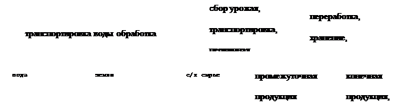 Например, в общем виде динамичный во времени и пространстве природно-сырьево-продуктовый процесс для водных и земельных ресурсов в оросительных мелиорациях можно представить в следующем виде: источник водозабора — вода в процессе доведения до полей (транспортировка воды в оросительных системах) — орошаемые земли (обработка земли) — сельскохозяйственное сырье (продукция), произведенное на этих землях, (сбор урожая) — продукция в процессе доведения до потребителя (транспортировка, хранение, переработка, реализация) — потребляемая продукция (см. рисунок 5.2).