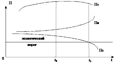 Как видно на рисунке 8.1, резкий рост искусственного плодородия за счет увеличения применения минеральных удобрений, пестицидов, техники может привести к увеличению экономического плодородия (на рисунке 8.1 временной период 0 – t0). Однако в случае продолжения тенденции падения естественного плодородия, после его снижения ниже уровня «экологического порога» (точка, соответствующая времени t1) происходит падение и экономического плодородия, несмотря на возможное резкое увеличение затрат в увеличение искусственного плодородия.