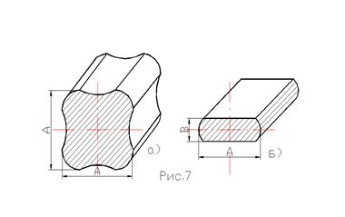 Блюм (рис.7а) является продуктом грубой (предварительной) прокатки слитков на обжимных станах (блюмингах). Размеры поперечных сечений блюмов регламентированы ГОСТ 4692-77 в пределах А=140-450мм с полем допусков размеров – 5% от размера А.