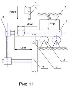 Резка на пресс-ножницах представлена схемой на рис. 11. Заготовка 1 диаметром d ЗАГ по рольгангу 2 подается до упора 3 в размер l ЗАГ. Прижимом 4 заготовка прижимается к нижнему ножу 7, закрепленному на столе пресс-ножниц 8. При ходе ползуна ножниц 5 вниз верхний нож 6 осуществляет отрезку заготовки заданных размеров.