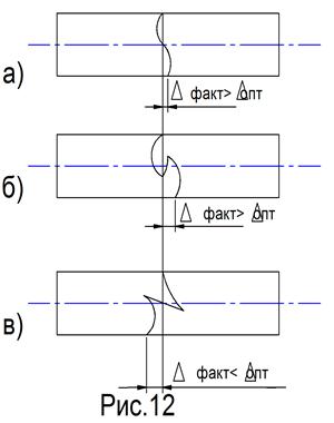 в) при малом зазоре между ножами (DФАКТ<DОПТ) в плоскости среза прутка появляется своеобразная «нашлепка» металла (рис.12в).