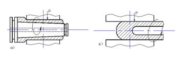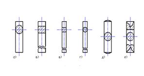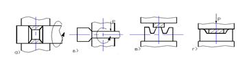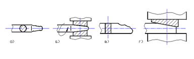 Вытяжка на конус и клин – этим разновидностям протяжки предшествует грубая проковка концевых частей заготовки на плоских бойках, после чего следует проковка подготовленных частей заготовки в конусных оправках или на клиновых подкладках (рис. 50а,б,в,г).