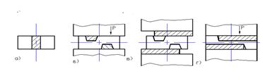 – ковка уступов и выемок, выполняемая осадкой части заготовки после ее пережима (рис. 53а,б,в,г);