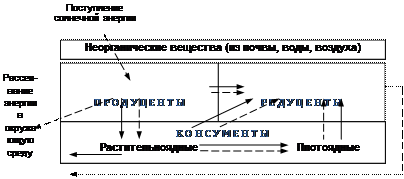 Рис. 2. Превращения энергии в биосфере (сплошные стрелки – круговорот веществ, прерывистые – поток энергии)