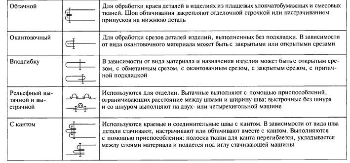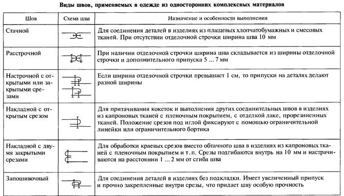 Срезы деталей из односторонних комплексных материалов соединяют следующими швами: стачными, расстрочными, настрочными, накладными, запошивочными, обтачными (табл. 4.1). Закрепки проставляют параллельно основной строчке на расстоянии 0,1...0,15 см от нее.