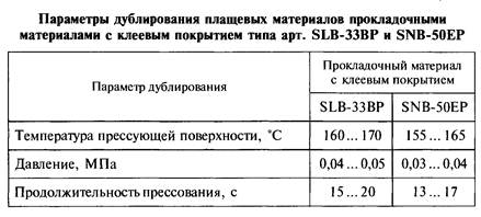 В табл. 4.4 представлены параметры дублирования деталей изделий из плащевых полиэфирных и смешанных тканей с водоотталкивающей пропиткой неткаными прокладочными материалами с клеевым покрытием типа арт. 8ЬВ-ЗЗВР и 8NВ-50ЕР (Великобритания). Указанные материалы позволяют создавать с плащевыми тканями достаточно прочные клеевые соединения.