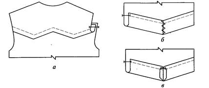 Если нижний срез кокетки имеет сложную конфигурацию, например в виде ломаной линии (рис. 4.4, а), то припуск на шов внешнего угла стачивают швом встык (рис. 4.4, б), предварительно высекая неровности ткани, или швом вразутюжку (рис. 4.4, в), срезая неровности материала.