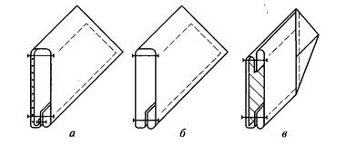 а – настрочным швом с открытыми срезами; б – накладным швом с одним закрытым срезом; в – накладным швом с одним закрытым срезом о одновременным прокладыванием канта;
