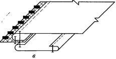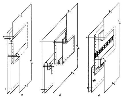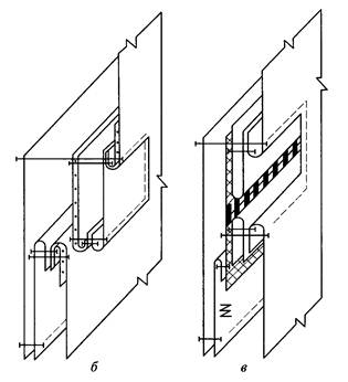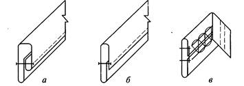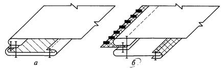 б— накладным швом с открытыми срезами; в — швом встык