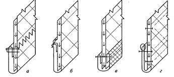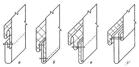 Нижний край отлетной подкладки обрабатывают швом вподгибку с закрытым срезом на машине зигзагообразного стежка (рис. 4.13, а); швом вподгибку с закрытым срезом на стачивающей машине, захватывая только утепляющую прокладку (рис. 4.13, б); окантовочным швом с использованием косой бейки (рис. 4.13, в); швом вподгибку с открытым обметанным срезом - - при небольшой толщине утеплителя и обязательном наличии стежки (рис. 4.13, г).