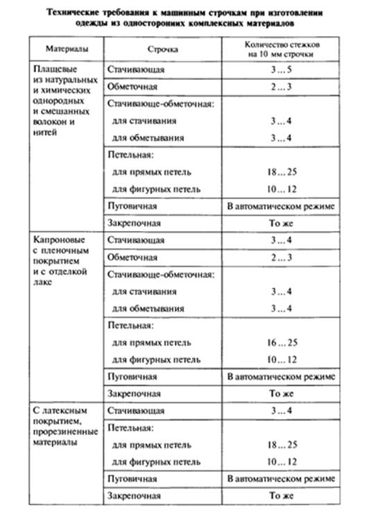 При обработке изделий стачивание швов производят на универсальных машинах с последующей обметкой швов или на стачивающе-обметочных машинах. Номера игл и ниток, частоту строчки определяют по ГОСТ 12807 - 67. Влажно-тепловую обработку изделий производят с увлажнением. Температура нагрева утюга должна быть не выше 140'С. При применении электропаровых прессов с вакуумным отсосом остаточной влаги из изделия время прессования до 30 с.