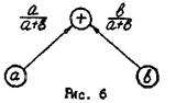 Если складываются два числа a и b, то у двух стрелок, входящих в кружок сложения, коэффициенты будут a/(a+b) и b/(a+b), как показано на рис. 6.