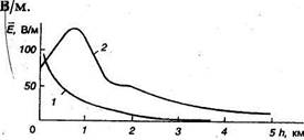 В атмосфере всегда присутствует электрическое поле. Все осадки, облака, пыль и туманы в атмосфере всегда заряжены в той или иной степени. Районы пыльных бурь, гроз, осадков имеют более сильные электрические поля, чем районы с «хорошей» погодой, где присутствует стационарное электрическое поле с напряженностью Е, равной примерно 130На рис. 1.7 представлена зависимость напряженности электрического поля Ё в зависимости от высоты h над уровнем моря (кривая 1) и континентами (кривая 2) для случая «хорошей» погоды. В целом атмосфера заряжена положительно, а Земля имеет отрицательный заряд, примерно