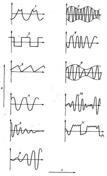 1 — периодическое, произвольной формы; 2 — прямоугольное; 3 — пилообразное; 4 — синусоидальное; 5 — затухающее; 6 — возрастающее; 7 — амшштудно-модулировавиое; 8 — частотво-модулированное; 9 — колебание, модулированное по амплитуде и фазе; 10 — случайное колебание по амплитуде и фазе; 11 — беспорядочное колебание (акустический, электрический шум)