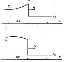 Поверхность, которая отделяет сжатый воздух от невозмущенного, называется фронтом ударной волны. На рис. 2.4 представлены распределения температуры Т и плотности р в ударной волне, фронт которой распространяется со скоростью uв. Толщина фронта ударной волны соответствует длине свободного пробега молекул. На практике этой величиной пренебрегают и с достаточной точностью заменяют фронт ударной волны поверхностью разрыва. При этом считают, что при прохождении газа через поверхность разрыва параметры газа меняются скачком (понятие «скачка уплотнения»). В соответствии с законами сохранения энергии, импульса, массы напишем: