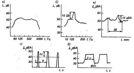 а — непрерывный спежтр (турбореактивный двигатель); б — тональный (осевой вентилятор); в — колеблющийся во времени (транспорт); г —импульсный спектр (удар молота); д — прерывистый (сбрасывание воздуха)