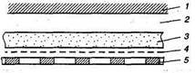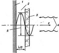 Для увеличения поглощения пористых материалов на низких частотах либо увеличивают их толщину, либо используют воздушный промежуток между материалом и ограждением (рис. 3.3). Максимум поглощения наблюдается тогда, когда воздушный зазор 2 между поверхностями конструкции 1 и материала 3 равен половине длины волны падающего звукового колебания 4. При этом будет максимальное увеличение потерь по трению, так как звукопоглощающий материал располагается в области 5 наибольшего колебательного движения.