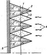 Решетчатые каркасы 3 заполняются пористым поглощающим материалом 1 (например, минеральной ватой), обернутым защитной стеклотканью 2, предохраняющей поглощающий материал от выдувания. Пирамидальные конструкции крепятся на стене 5. Коэффициент отражения звуковой волны 4 в данном случае ничтожно мал (£3%), а общее поглощение таких конструкций может быть большим в широком частотном диапазоне. Применение звукопоглощающих материалов и пирамидальных конструкций особенно полезно при разработке звукомерных камер, в которых коэффициент отражения звуковой волны от стен должен быть ничтожно мал.
