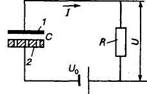 Тонкая мембрана 1 является подвижной системой и одновременно обкладкой плоского конденсатора, вторая обкладка 2 которого выполнена в виде неподвижного массивного электрода с отверстиями. Эти отверстия обеспечивают необходимые диссипативные свойства воздушного зазора конденсатора. Под действием падающей звуковой волны мембрана колеблется, изменяя при этом емкость С конденсатора. Разрядно — зарядный ток I, текущий по сопротивлению R, создает напряжение U, временная зависимость которого повторяет форму звукового сигнала. При наличии на обкладках конденсатора электретного материала необходимость в источнике питания Uo отпадает, так как электрет в зазоре создает требуемое электрическое поле. Конденсаторные микрофоны могут быть комбинированными, градиентными и приемниками давления.