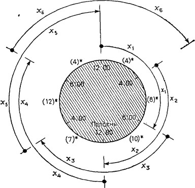Это решение приемлемо лишь в том случае, если расписание смен будет соответствовать обычному трехсменному графику работы. Однако может оказаться, что выгоднее график работы, составленный на основе оптимального выбора начала каждой из смен. Можно, например, принять такой график работы, когда начало одной смены смещено относительно начала следующей смены на 4 ч. Такой график работы с перекрывающимися сменами показан на рис. 1.3 для случая, когда смены начинаются в 0:01, 4:01, 8:01, 12:01, 16:01, 20:01, причем продолжительность смены составляет 8 ч. Теперь действительно есть возможность идентифицировать переменные, для чего целесообразнее использовать следующие обозначения: