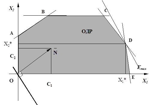 Для получения прямой F= c1 x1 + c2 x2 = 0 построим градиент функции Fgrad N (∂F/∂x1 ,∂F/∂x2) с координатами (c1 ,c2), указывающий направление возрастания F, и через точку О проводим прямую, перпендикулярную этому вектору. Далее, построенную прямую F=0 перемещаем параллельно самой себе в направлении вектора N. На рис. 1.4 видно, что опорной по отношению к ОДР эта прямая становится в точке D. В этой точке F принимает max. Проецируя точку D, на оси ОХ1 и ОХ2 находим оптимальные значения Х1* и Х2*. Подставляя Х1* и Х2* в F находим max F, т.е. F*.