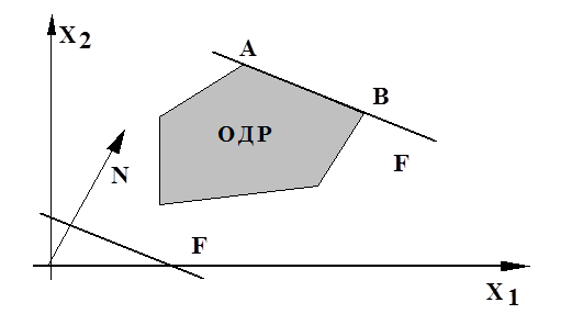 прямая уровня (1.13) функции F будет перемещаться по плоскости параллельно самой себе в направлении возрастания значений F. При таком перемещении первая точка встречи прямой с ОДР соответствует min F, а точка выхода прямой уровня из ОДР - max F (рис. 1.4).