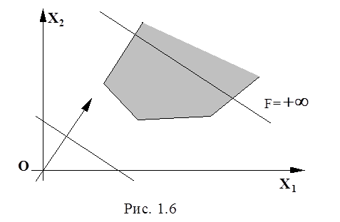 ) рис. 1.6, либо когда оптимальное решение не единственно (min F или max F) и достигается не в одной точке, т.е. линии уровня проходят по стороне многоугольника (рис. 1.5).