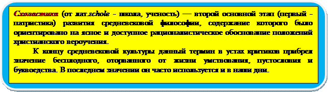 | Ранняя схоластика IX-XII вв. | Иоанн Скотт Эриугена (810-877) | Крупный западноевропейский философ IX в. («первый отец схоластики»), утверждавший, что истинный авторитет не противоречит правильному разуму, так же как правильный разум — истинному авторитету, поскольку оба они проистекают из одного и того же источника — божественной мудрости. Иными словами, в вопросе соотношения знания и веры, он не видел противоречия. Однако первичным считал разум. По Эриугене, авторитет рождается из разума, но не наоборот. В решении проблемы универсалий стоял на позициях реализма, т.е. признавал реальное существование общих понятий вне конкретных вещей. Основные работы — «О божественном предопределении» и «О разделении природы». В последней работе Эриугена делит природу на четыре ступени: 1) нетворимая, но творящая (Бог как творец всего сущего); 2) творимая и творящая (сын Бога, или Логос, посредник между Богом и миром); 3) природа творимая и нетворящая (мир, существующий в пространстве и времени); 4) нетворимая и нетворящая (Бог как конец и цель всех вещей). | |