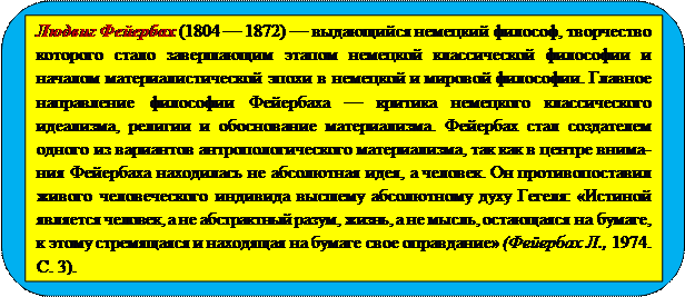 | Социально - политические взгляды | Фейербах считал, что человек представляет собой уникальное биологическое существо, наделенное волей, разумом, чувствами, желаниями. При этом полноценная реализация человеком своего «Я» возможна только во взаимодействии с «Ты» (т.е. другими людьми), т.е. человек может жить только в обществе. Основой связей между людьми в обществе, стержнем общества должна стать религия, которая, по его мнению, должна быть основана не на вере в выдуманное сверхъестественное существо (Бога), а на иных принципах. Фейербах был убежден, что необходимо отбросить традиционную религию (христианство, мусульманство и т.д.) и заменить ее религией любви людей друг к другу и религией любви внутри семьи как наиболее отвечающей природе человека, а смыслом жизни человека должно быть стремление к счастью. |