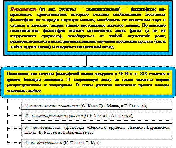 | Постпозитивизм | Карл Поппер (1902-1994), Имре Лакатос (1922-1974), Томас Кун (1922-1996), Пол Фейерабенд (1924-1994) | Данное направление позитивизма будет подробно рассмотрено в схеме 105-106. |