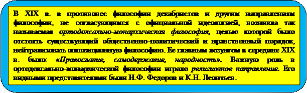 ê Константин Николаевич Леонтьев (1831-1891) посвятил свою философию критике негативных явлений русской жизни. В центре данной критики был развивающийся капитализм. По мнению Леонтьева, капитализм — это царство «хамства и подлости», путь к вырождению народа, гибели России. Спасением для России является отказ от капитализма, изоляция от Западной Европы и превращение ее в замкнутый православно-христианский центр (по образу Византии). Ключевыми факторами жизни спасенной России должны стать, помимо православия, самодержавие, общинность, строгое сословное деление. Исторический процесс Леонтьев сравнивал с жизнью человека. Как и жизнь человека, история каждого народа, государства зарождается, достигает зрелости и затухает. Если государство не стремится к своему сохранению, оно погибает. Залог сохранения государства — внутренне деспотическое единство. Цель сохранения государства оправдывает насилие, несправедливость, рабство. Согласно Леонтьеву, неравенство между людьми — желание Бога и поэтому оно естественно и оправдано.