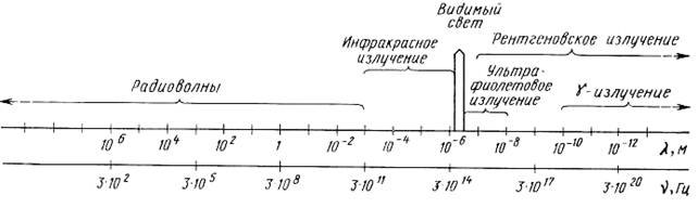 Из теории Максвелла вытекает, что различные электромагнитные волны, в том числе и световые, имеют общую природу. В связи с этим целесообразно представить всевозможные электромагнитные волны в виде единой шкалы (рис.). Вся шкала условно подразделена на шесть диапазонов: радиоволны (длинные, средние и короткие), инфракрасные, видимые, ультрафиолетовые, рентгеновские и гамма-излучение. Эта классификация определяется либо механизмом образования волн, либо возможностью зрительного восприятия их человеком.