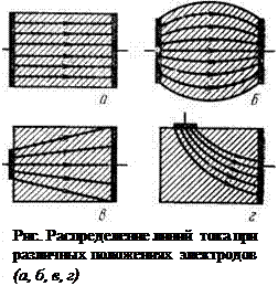 Измерение электросопротивления тканей и органов животных представляет значительную трудность по следующим причинам. Во-первых, простая формула для вычисления сопротивления (R = rl/S)применима только для проводников, имеющих вид прямоугольных пластин, проволок и т. п. с расположением электродов на их торцах. При этом линии тока параллельны образующим проводника (рис. а). Если это условие не выполнено (рис. б, в, г), то применять указанную формулу нельзя.