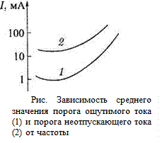 Пороговые значения тока зависят от частоты. На рис. показана зависимость среднего значения порогов тока (для мужчин).