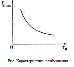 При использовании импульсного тока раздражающее действие зависит от формы, амплитуды и длительности импульсов. Особенно сильно влияет на характер воздействия крутизна фронта импульса. При увеличении крутизны фронта уменьшается пороговая сила тока, который вызывает раздражение. Наибольшей крутизной переднего фронта обладают прямоугольные импульсы поэтому пороговая сила тока, который вызывает раздражение, для них минимальна. Вместе с тем, пороговое значение зависит и от длительности импульса. Кривая, отображающая эту зависимость, называется характеристикой возбуждения и показана на рис.