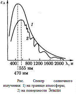 У поверхности Земли спектр солнечного излучения имеет более сложную форму, что связано с поглощением в атмосфере. Максимуму этого спектра соответствует длина волны l 2,max = 555 нм, что соответствует наилучшей чувствительности глаза.