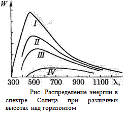 Для биологических систем, существующих на земной поверхности, важным является то, как распределена энергия в спектре солнечного излучения. Это распределение резко меняется в зависимости от положения Солнца на небесном своде. При различной высоте над горизонтом солнечным лучам приходится проходить разные толщи атмосферы, которая рассеивает и поглощает эти лучи различным образом для разных длин волн. На рис. приведены сглаженные кривые распределения энергии солнечного света: I – за пределами атмосферы; II – при положении Солнца в зените; III – при высоте 30° над горизонтом; IV –- при условиях, близких к восходу и закату, (10° над горизонтом).