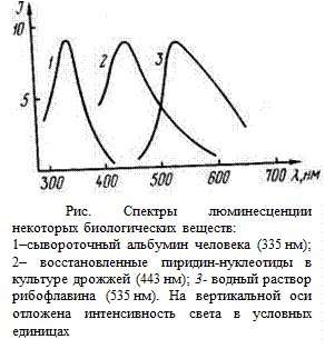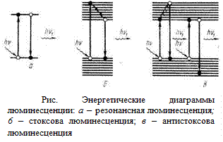 Поскольку электроны совершают переходы не между двумя уровнями, как это имеет место при резонансной флуоресценции, а между полосами, состоящими из многих подуровней, свет, испускаемый при стоксовой и антистоксовой люминесценции, имеет не одну частоту, а более или менее сложный спектр (рис.). Поскольку такие спектры могут перекрываться со -спектром поглощенного света, то правило Стокса имеет более общую формулировку: максимум спектра люминесценции сдвинут по отношению к максимуму спектра поглощения в сторону более длинных волн.