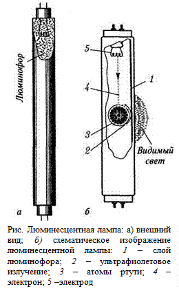 Источники света. Для производственных и санитарно-гигиенических целей важны источники света, которые по своему спектру больше соответствуют видимому свету. Таким источником являются созданные на основе фотолюминесценции люминесцентные лампы. В этом источнике ультрафиолетовое излучение преобразуется с помощью люминофора в видимое излучение.