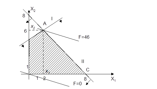 В прямой задаче max целевой функции достигается в точке A (X1 = 2; X2 = 6) (рис. 1.14).