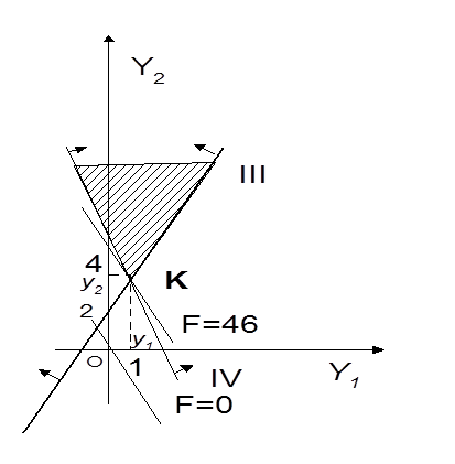 Минимальное значение целевая функция F* двойственной задачи принимает в точке K (рис. 1.15). Следовательно, Y*1 = 1, Y*2 = 4 - оптимальный план двойственной задачи и F*min = 46.