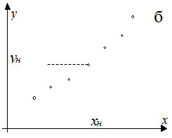 2. Интерполяции – на основе обработки экспериментальных данных требуется найти координату какой-либо неизвестной точки (x, y) на данном интервале, в пределах диапазона измеряемой величины (рис. 2.1,б).
