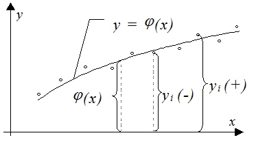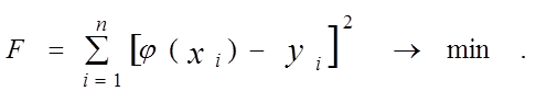 Требуется так подобрать параметры функции j(x), чтобы разности j(xi) – yi (i= 1, n) были наименьшими. Так как разности могут быть как положительными, так и отрицательными (рис. 2.2), то за критерий качества аппроксимации принимают наименьшую сумму квадратов разностей: