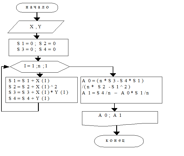 Алгоритм вычислительного процесса для аппроксимации результатов наблюдений линейной эмпирической формулой показан на рис. 2.3, где