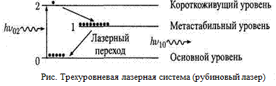 Из всего множества энергетических уровней атома хрома в (в рубиновом лазере используются три: основной, первый (метастабильный с время жизни около 3 мс) и второй уровень с малым временем жизни (рис.).