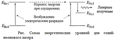 Первый возбужденный уровень атома гелия совпадает с уровнем 2 для атома неона. Поэтому при соударении возбужденных атомов гелия с невозбужденными атомами неона происходят передача энергии последним и перевод их в возбужденное состояние 2. Таким образом, атомы гелия способствуют увеличению населенности уровня 2 атомов неона. Разгрузке уровня 1 у атомов неона способствуют их столкновения со стенками трубки, в результате которых они отдают энергию и переходят с уровня 1 на уровень 0. Наиболее эффективно этот механизм разгрузки действует при диаметре трубки около 7 мм. В трубке создается активная среда, состоящая из атомов неона с инверсной населенностью уровней 2 и 1. Спонтанный переход отдельных атомов неона с энергетического уровня 2 на уровень 1 вызывает появление фотонов. При дальнейшем взаимодействии этих фотонов с возбужденным атомами неона возникает индуцированное когерентное излучение последних. Чаще всего используются гелий-неоновые лазеры с длиной волны 632,8 нм, мощностью 100 мВт.