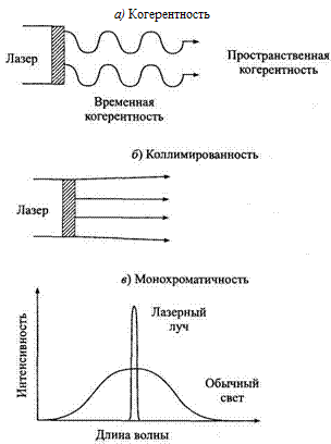 Устройство лазера и свойства вынужденного излучения обуславливают отличие лазерного излучения от излучения обычных источников света. Лазерное излучение (ЛИ) характеризуется следующими важнейшими свойствами.