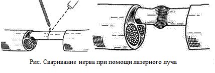 38.11.1. Лазерная сварка тканей. Соединение рассеченных тканей представляет собой необходимый этап многих операций. Лазер могут с успехом использоваться для решения этой задачи. Для сварки тканей используется различные лазеры. Для большинства тканей при сварке целесообразно, чтобы нагревание, ведущее к оплавлению и последующей сварке, происходило по возможности главным образом в наружном, самом прочном слое будущего анастомоза (соустье между сосудами). Защиту от обширного по объему и чрезмерного по температуре нагрева свариваемых структур осуществляют либо с помощью специально подбираемого режима работы или путем нанесения на поверхность будущего шва специального припоя, интенсивно поглощающегося свет в области излучения данного лазера. На рис. показано сваривание одного из стволов крупного нерва, осуществляемого в контактном режиме с использованием припоя, который каплями из пипетки подается по месту сваривания.